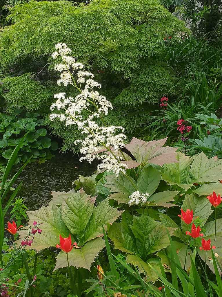 The final treat of the day was Margot’s stunning plant of Rodgersia podophylla ‘Instow’, growing next to her pond. This plant has been in the scheme since 2008, but is not often offered in the annual exchange. This is the first year it had flowered for Margot, no doubt due to all the rain. It was particularly lovely surrounded by her red tulips ‘Sprengeri’.