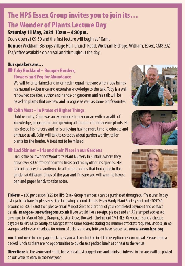 Being a member of the Hardy Plant Society in Essex gives you an invaluable source of experience, knowledge and wisdom in the care of plants in our soils and our unique climate. I hope that, like me, you are looking forward to a lively programme of meetings, talks and garden visits in 2024. My thanks to all members, and especially our Committee and volunteers, for making this a wonderful, warm and friendly organisation. Have a very happy Christmas and I wish you great gardening in the new year.